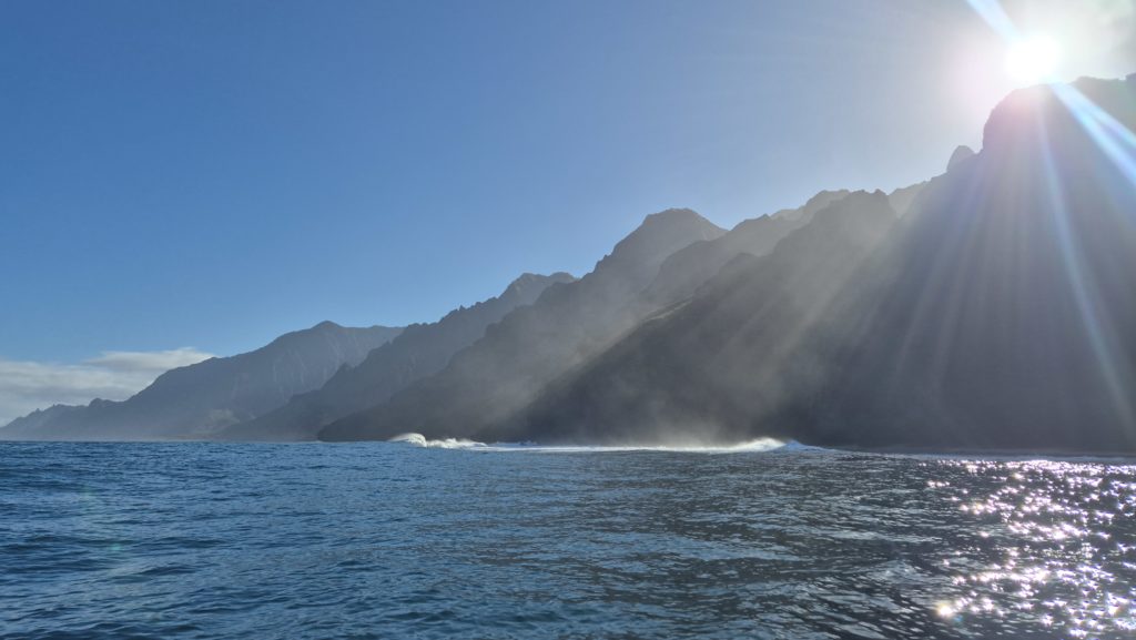 A Na Pali? Jest osobliwe, majestatyczne, jedyne w swoim rodzaju. Strzeliste skały pokryte soczystą zielenią. Do tego słońce próbujące przebić się przez ostre wierzchołki. Tutaj nawet kręcono sceny Jurassic Park.