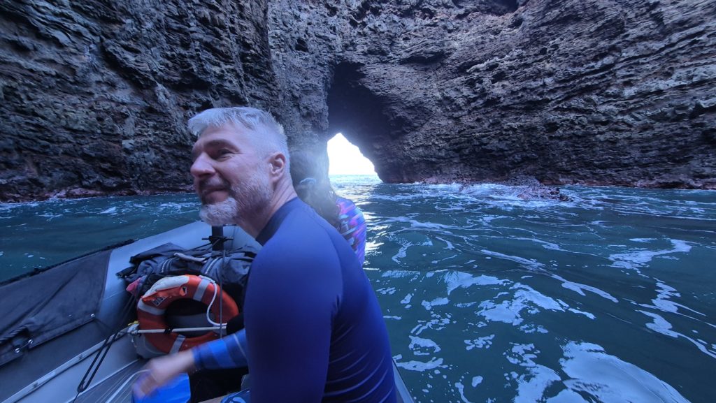 Po spokojnym wypłynięciu z portu nasz kapitan odkręca na maksa muzykę oraz dwa wielkie silniki. No wyrwało nas ale to nic przy zakrętach. Najpierw w prawo, wszyscy z przeciwnej buty wiszą nade mną, potem w lewo, ja wiszę nad nimi. Poza przerażeniem mocny zastrzyk adrenaliny. Cholernie nam się podoba 😁