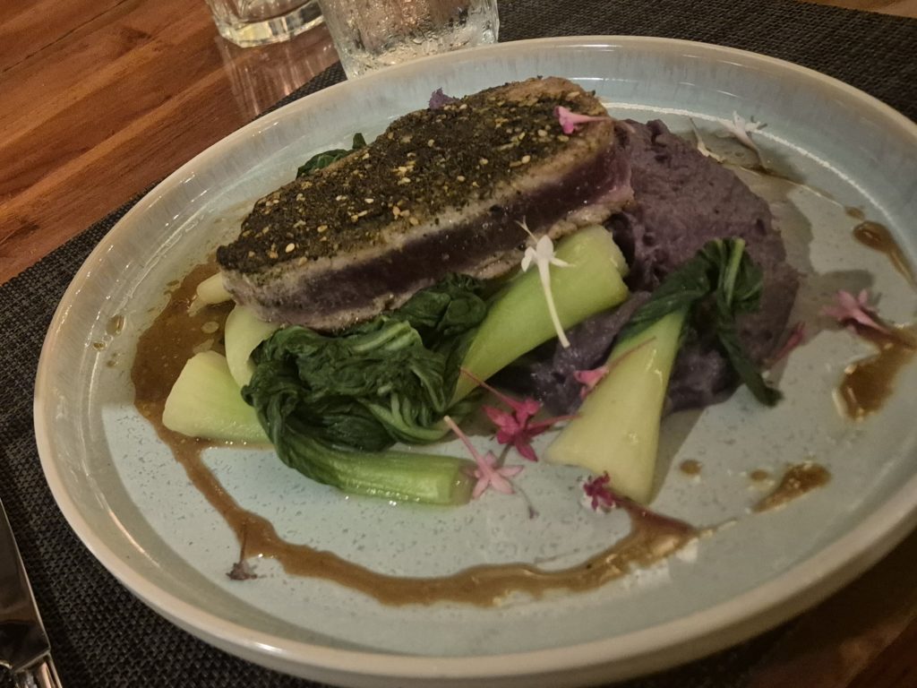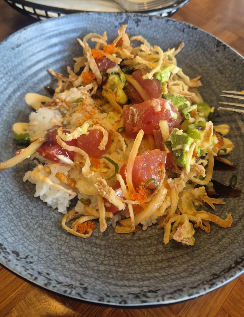 Ważną sprawą jest tu lokalna kuchnia. Mieliśmy duże obawy, że będzie niezdrowe i paskudne amerykańskie żarcie. Co za miła niespodzianka. Wpływ japońskiej kuchni stworzył tu kulinarne arcydzieło. Ahi czyli tuńczyk serwowany na surowo jako poke bowl albo stek medium rare. Do tego ryż gotowany z japońskim kunsztem jak do sushi.